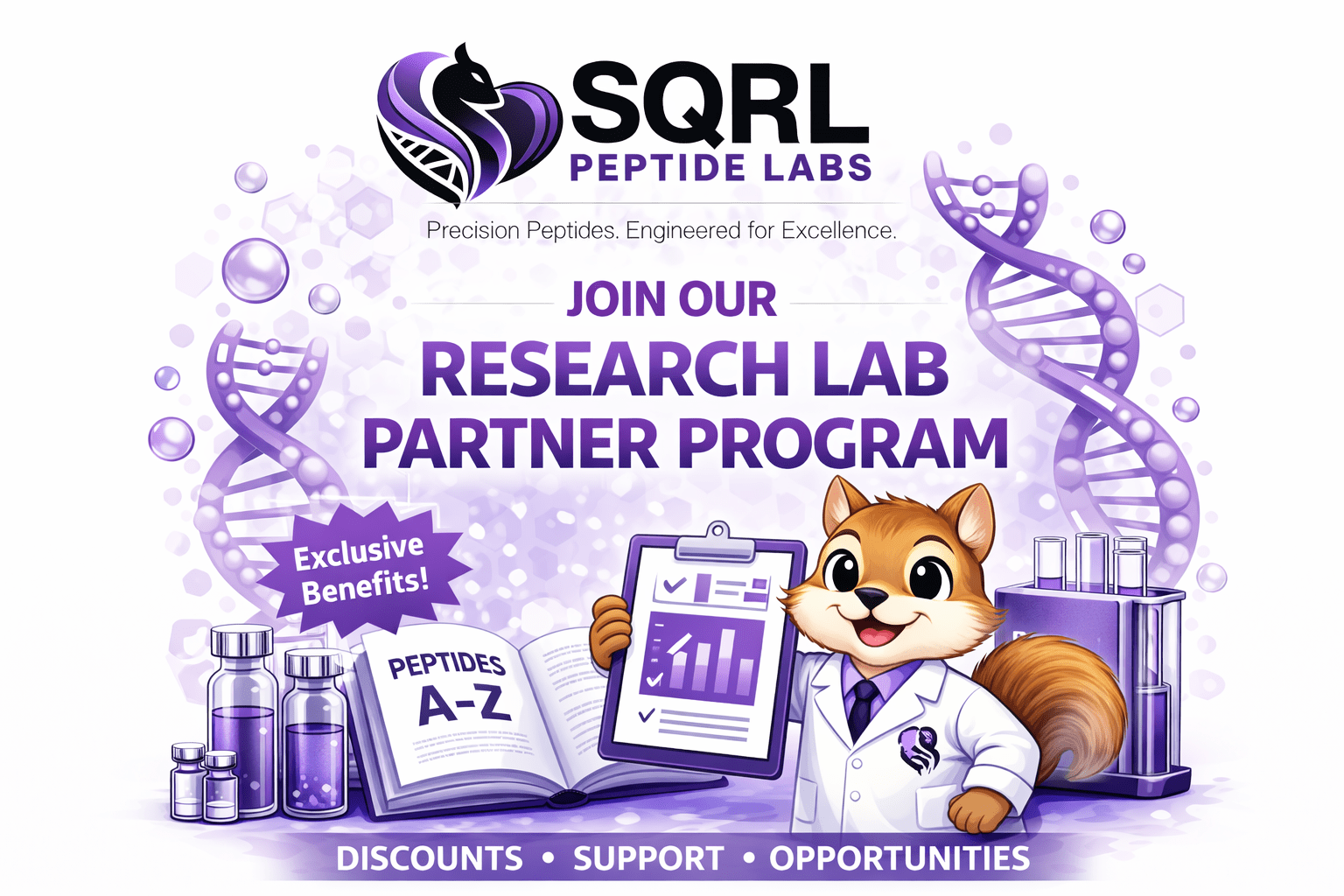 At SQRL Peptide, we believe in the power of science and community. Our SQRL Research Lab Partnership Program is built for passionate individuals and organizations who share our dedication to advancing peptide research. By joining our network, you’ll gain access to exclusive rewards, special product offers, and collaborative resources — all while helping others discover high-quality research peptides trusted by professionals worldwide.